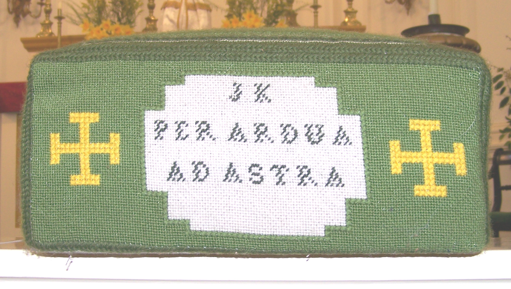 A particularly beautiful example: Mary D’Arcy Kenyon’s hassock, embroidered by her great-grandson, Robin Bramley - Hassocks number 62 and 64: sero sed serio: “Late but in earnest,” the motto of the Clan of Kerr, to whom the Kenyons and their descendants are related.