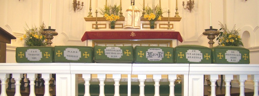 Each hassock was separately sponsored, and has been individually embroidered locally in memory of a different parishioner, living or dead. Some remember whole families, or ask the kneeler to pray for a former parish priest.