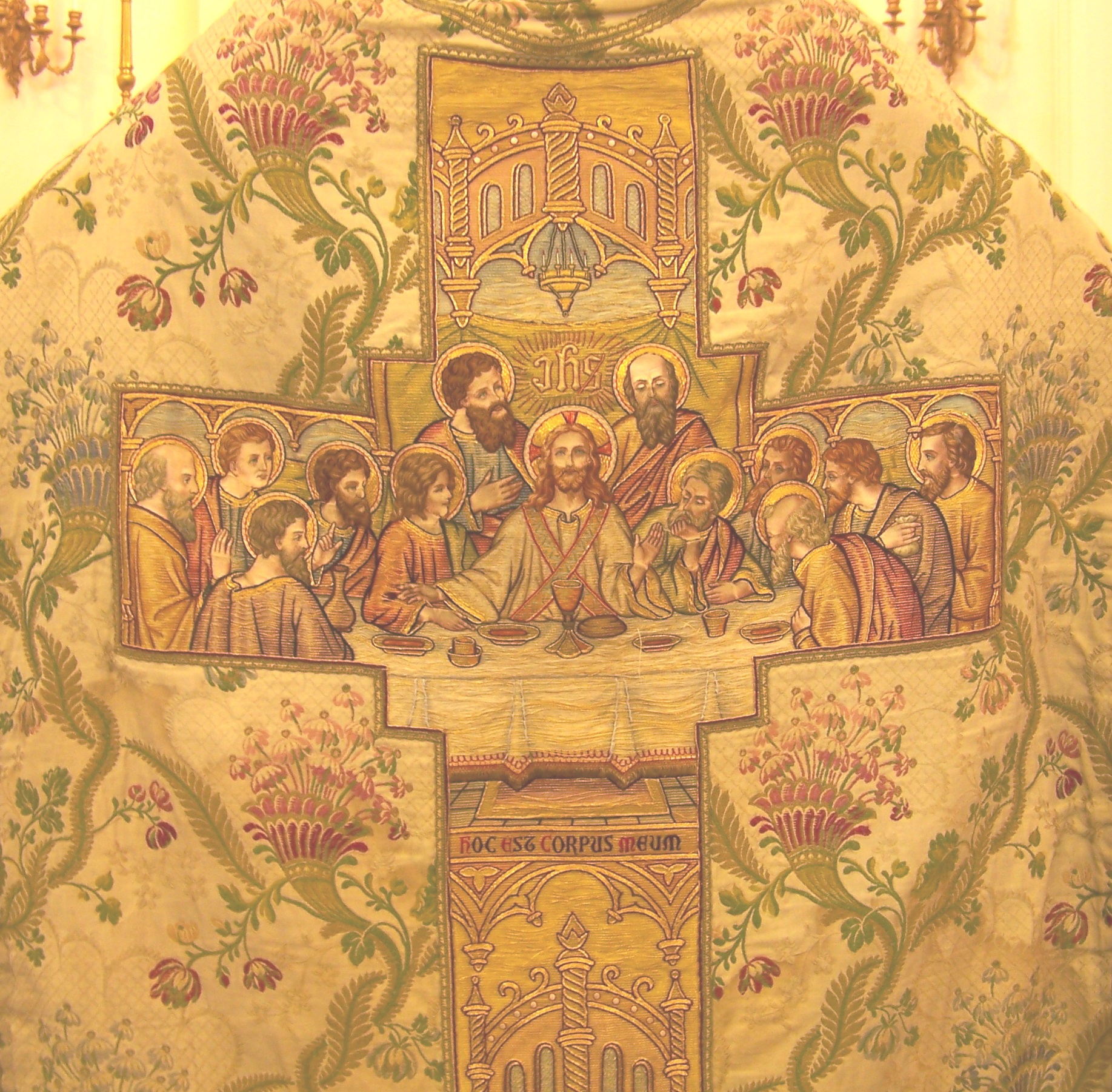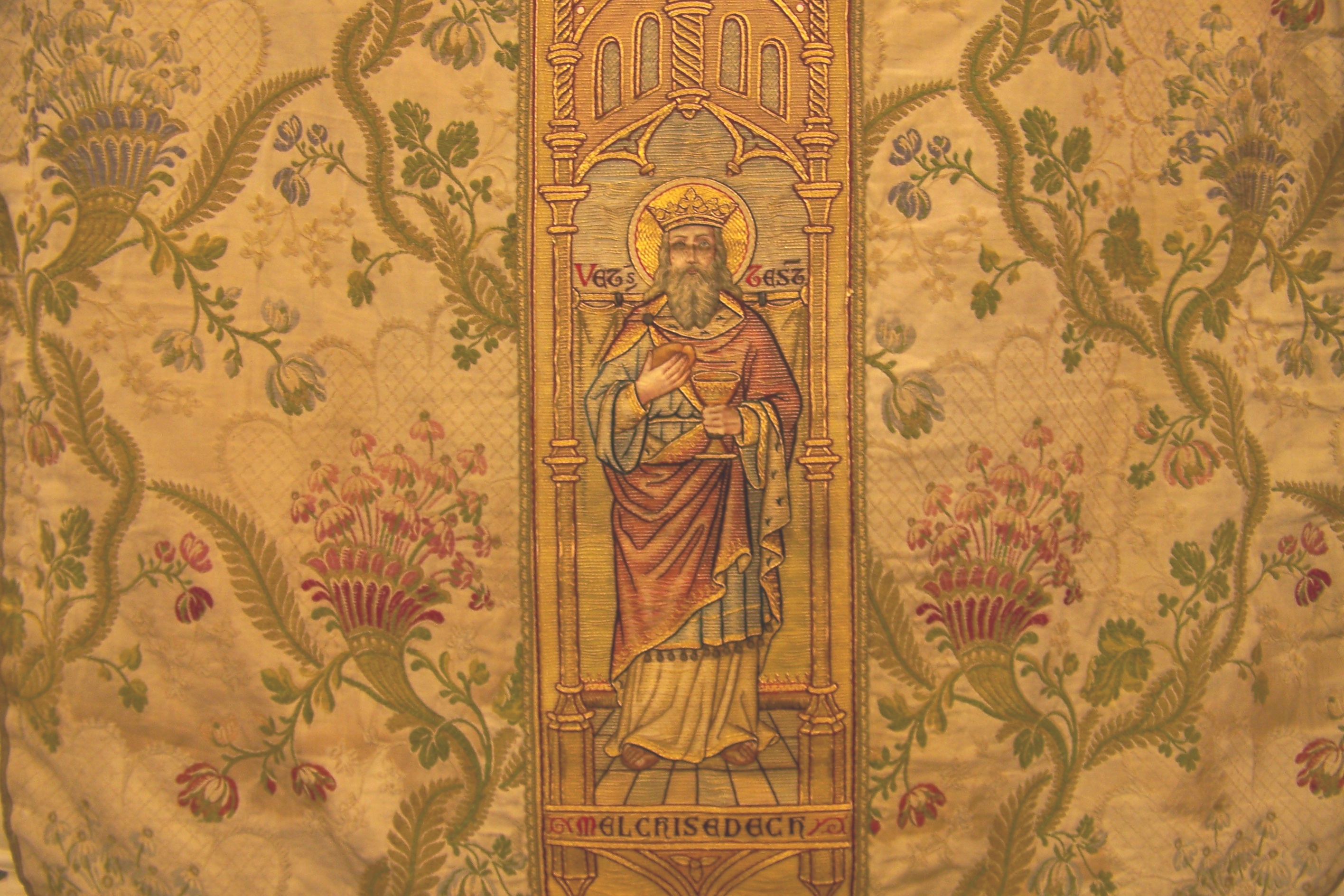 Beautiful embroidery showing the Last Supper.Detail: MelchisedechAnother detail of a vestment, showing an angelAbraham sacrificing IsaacA closer view of Abraham and Isaac